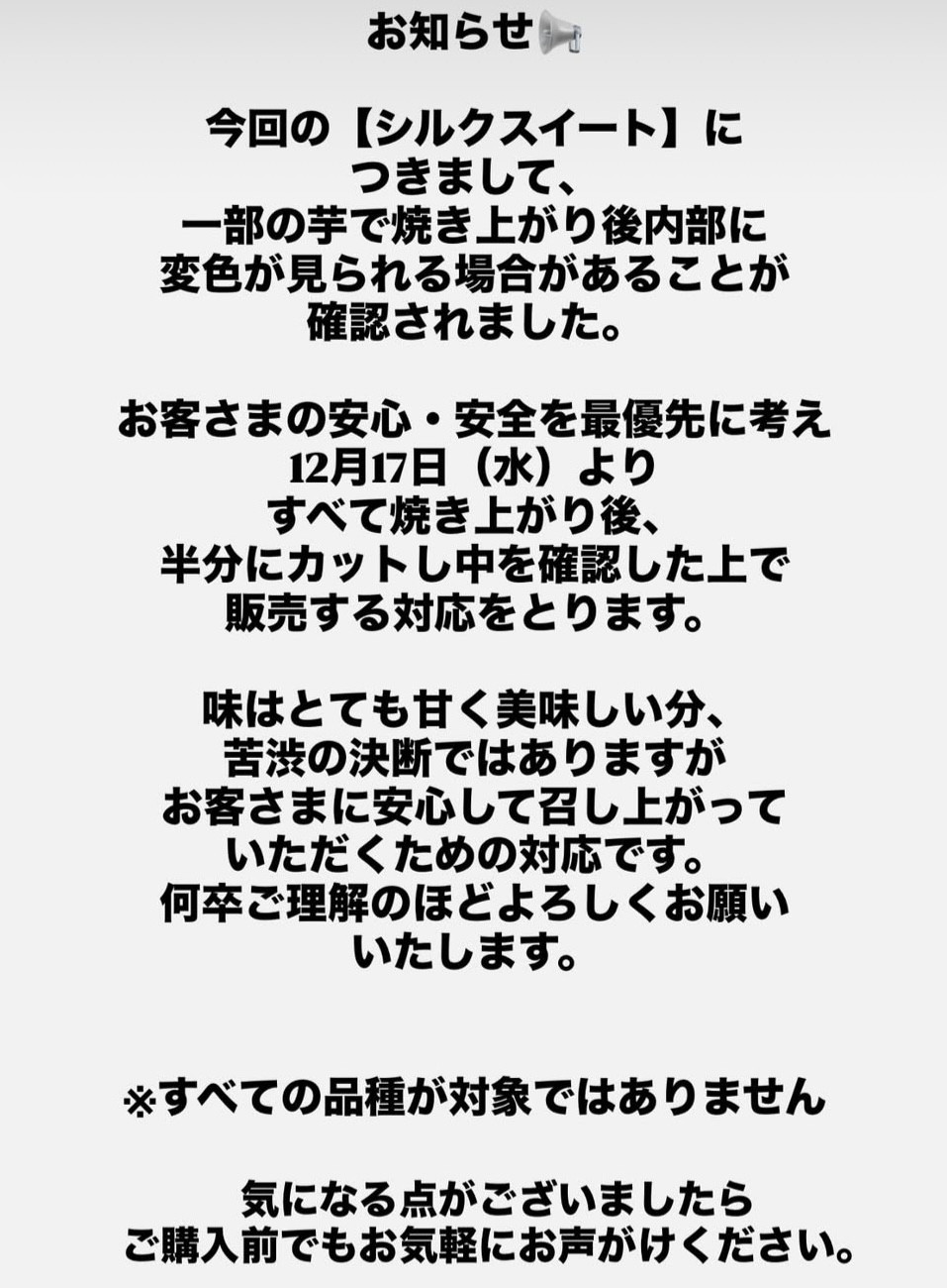 ご好評のシルクスイートなのですが、ごく稀にイタミが見受けられるお芋があるため下記のとおり対応しております。