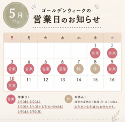 5月上旬は不規則にお休みをいただきますので詳細はカレンダーをご覧ください🙇